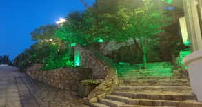度假村園區(qū)局部亮化工程,采用綠色和暖色照樹燈從下晚上照亮樹木的同時打出美麗的光影效果,樓梯采用大功率暖色投影燈照射,施工出現(xiàn)效果期待整體完美效果。